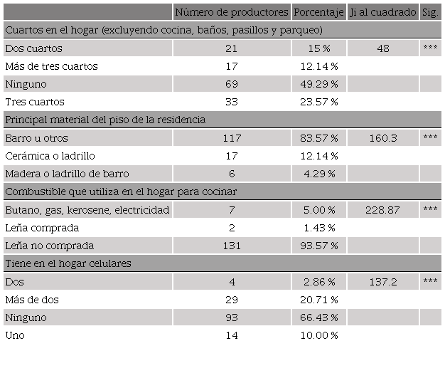 La mitad de los productores encuestados, 49.29 % [c2 (3, 48) p < 0.001] habitan en hogares sin ninguna división para cocina, baño, pasillos; los pisos principalmente son de barro, 83.57 % [c2 (2, 160.3) p < 0.001], lo que muestra las condiciones desfavorables de estas familias y la poca inversión en la infraestructura del hogar (véase tabla 3). Este aspecto contrasta con lo informado en el estudio sobre diagnóstico socioeconómico en Yaguaraparo, Venezuela (Lanz y Granado 2009), que reporta que el 60 % de los productores habitan en casas de buenas condiciones o regulares y en un ambiente sanitario aceptable. Es decir, la mayoría de los productores se ha preocupado por darle una buena condición de vida a su familia en lo relacionado con la vivienda (Lanz y Granado 2009), así como los productores cacaoteros hondureños, de los cuales solo el 8.47 % cuentan con un cuarto (Sobalbarro et al. 2020). Casi el total de hogares encuestados, 93.57 % [c2 (2, 228.87) p < 0.001], utiliza leña recolectada por ellos mismos como combustible en el hogar. Este aspecto es importante, ya que reduce en alguna medida los gastos y fortalece la economía familiar, y parte de esa leña utilizada proviene de los sistemas de producción de cacao (Somarriba et al. 2014).