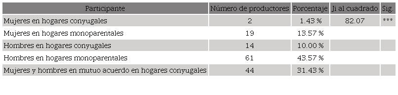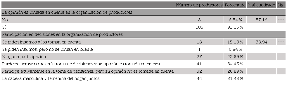 La participación de los productores en sus organizaciones o cooperativas es de vital importancia. En la tabla 8 se observa que el 93.16 % [c2 (1, 87.19) p < 0.001] menciona que su opinión es tomada en cuenta, pero solo 34.45 % [c2 (4, 38.94) p < 0.001] participa activamente en la toma de decisiones, a pesar de ser uno de los principios fundamentales en el sistema cooperativo (Majee y Hoyt 2011). Esto concuerda con lo reportado en estudios anteriores, por ejemplo, Pérez, González y Dávila (1985) mencionan que las decisiones y el control de los ingresos eran tomadas por los hombres (Farah Quijano y Pérez Correa 2003).