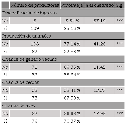 El 22.9 % [c2 (1, 41.6) p < 0.001] de los productores consideran relevante la producción pecuaria como una fuente de ingresos; de estos, el 33.64 % [c2 (1, 11.45) p < 0.001] se dedican a la crianza de ganado vacuno como fuente de ingresos. Así también, cerdos y aves son criados para la obtención de ingresos en un 67.59 % [c2 (1, 13.37) p < 0.001] y 70.37 % [c2 (1, 17.93) p < 0.001], respectivamente.