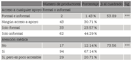Se detectó que menos de un cuarto de los encuestados reciben apoyo formal, ya sea de una organización o del gobierno, mientras que el 44.3 % [c2 (3, 53.89) p < 0.001] mencionó que recibe apoyo de manera informal, ya de sea de familiares o amigos (véase tabla 7). Asimismo, en cuanto a la atención médica, el 67.1 % [c2 (2, 73.56) p < 0.001] refirió que tienen acceso. Este aspecto es importante recalcarlo, ya que incide en la economía familiar, significando una reducción de los gastos en este servicio. Además, este es un derecho en todos los países (Kliksberg 2002).
