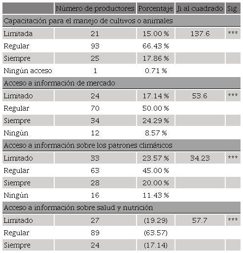 En la economía familiar rural, el acceso a la información tiene que ver con aspectos como el manejo de cultivos, la información de mercado, los patrones climáticos y la salud (véase tabla 9). La información agrícola es fundamental para los pequeños productores, ya que promueve el vínculo de la producción con el mercado y, por ende, la mejora de los ingresos en el seno del hogar (Masuki et al. 2010). Los resultados de la presente investigación muestran que 66.43 % [c2 (3, 137.6) p < 0.001] de los productores tienen acceso regular a la información sobre las prácticas de manejo de los cultivos, obtenida a través de los procesos de capacitación. Resultados similares son reportados por Hernández Gómez et al. (2015) en su estudio sobre los factores socioeconómicos y parasitológicos que limitan la producción del cacao en Chiapas, México, donde se encontró que 53.2 % de los productores buscaron y recibieron capacitación sobre manejo de cultivos; opuesto a lo encontrado por Lanz y Granado (2009), donde el 81 % de los productores no ha recibido ningún tipo de capacitación sobre el cultivo.