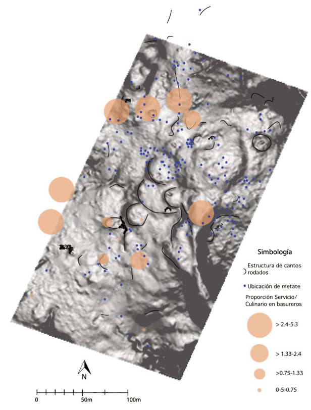 La distribución de metates en el asentamiento muestra su concentración en la zona fronteriza entre los sectores de estatus alto e intermedio. La poca correspondencia entre la distribución de actividades de procesamiento, tanto por la presencia de vasijas culinarias como de metates, y las de servicio sugiere la segregación de los espacios para la preparación y el consumo de alimentos (Rosenswig 2007; Turkon 2004, 227-228). Esta segregación podría indicar un mecanismo mediante el cual las élites redujeron su papel en las tareas domésticas y se concentraron en actividades de servicio, incluyendo los festines.