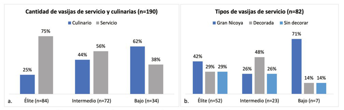 Por otro lado, sectores de estatus intermedio y bajo presentan cantidades moderadas de vajillas de servicio y una proporción similar entre la cerámica para servir y la utilizada para cocinar y almacenar alimentos (véase fig. 3a). Los basureros de estatus intermedio contienen una alta proporción de vasijas decoradas de manufactura local, mientras que los de bajo estatus tienen una mayor proporción de vasijas de la Gran Nicoya; pero estas corresponden a escudillas incisas, a diferencia de las policromadas que dominan los conjuntos cerámicos de élite (véase fig. 3b). En este sector también se documentan metates y manos de moler, pero en menores proporciones, y son, en su mayoría, simples y poco decorados. Al momento, no se ha identificado un contexto de procesamiento de alimentos en zonas de estatus intermedio y bajo, como el descrito para la zona de élite.