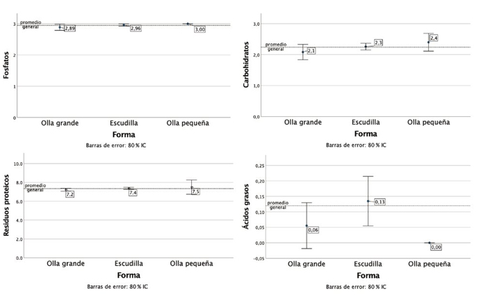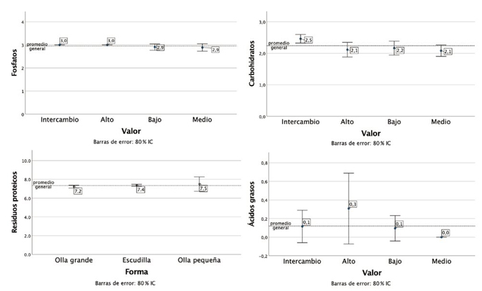 Los resultados del análisis del enriquecimiento químico y su relación con el valor de los recipientes cerámicos no indica diferencias significativas (en intervalos de confianza del 80 %) en la mayoría de los grupos de estudiados (véase fig. 6). El único caso en que se registra una diferencia significativa corresponde con la presencia de carbohidratos en las vasijas de intercambio, con respecto a las vasijas locales de valor medio. Se reporta la presencia de residuos proteicos en tres ejemplares de intercambio de alto valor, en una escudilla local de alto valor y en dos ollas de bajo valor. Las escudillas y ollas de valor medio no contenían residuos proteicos.