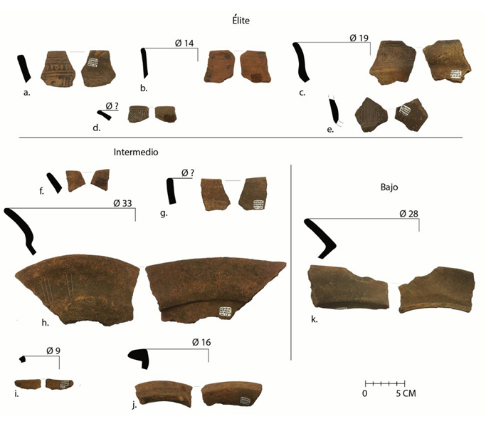 Las excavaciones en todo el asentamiento han permitido identificar tres estratos socioeconómicos, con conjuntos materiales diferenciables. La distinción socioeconómica se basa en la distribución y la proporción de los materiales, así como en los criterios de valor de estos últimos, a partir de los pasos de producción escalonada (Feinman, Upham y Lightfoot 1981). Adicionalmente, la ubicación dentro del asentamiento junto con factores asociados como la altitud, visibilidad y defensa también fueron determinantes para la ubicación de los distintos estratos socioeconómicos (Núñez Cortés 2020a, 2020b; Núñez-Cortés y Ruiz-Cubillo 2022).