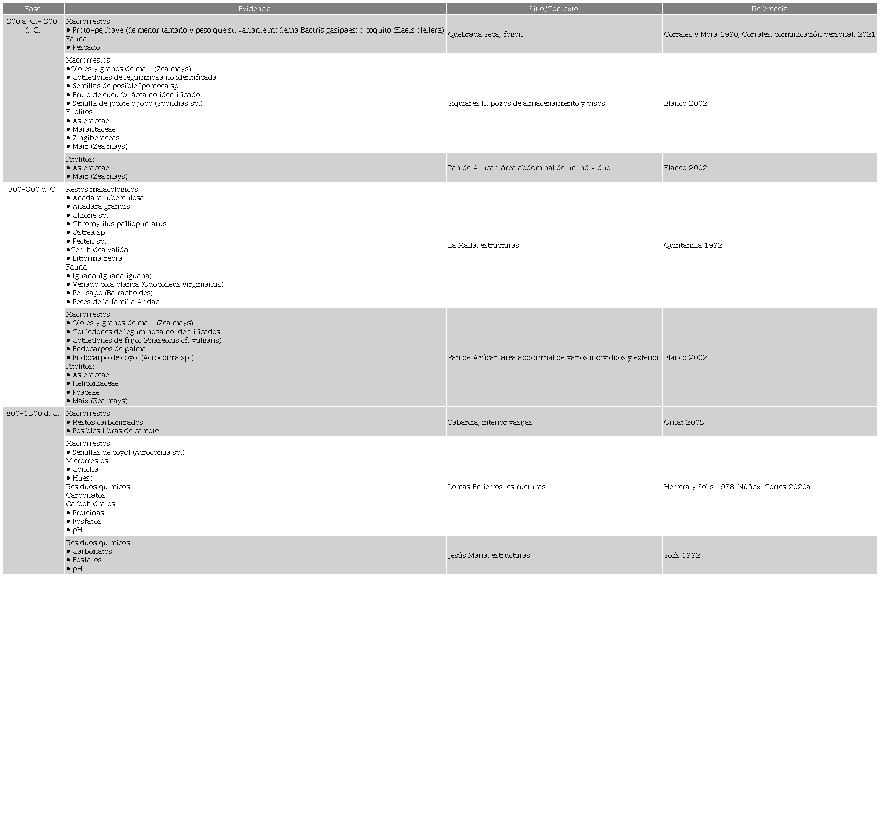Aunque las investigaciones arqueológicas que contienen datos directos sobre alimentación son pocas para la subregión Central Pacífica de Costa Rica, se han logrado recuperar restos macro y micro botánicos, malacológicos y de fauna, microrrestos y residuos químicos en contextos que brindan información acerca de prácticas alimentarias del pasado. En este apartado se realiza una revisión de la información más relevante sobre contextos arqueológicos que indican una relación con prácticas de consumo o preparación de alimentos para varios periodos de tiempo (tabla 1). Esta revisión incluye datos del sitio arqueológico Lomas Entierros y de otros sitios ubicados en zonas costeras y montañosas cercanas a este.