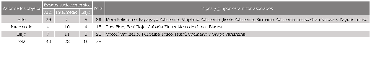 Las élites, ubicadas en el norte del asentamiento y en los sectores de mayor elevación, tenían acceso a muchos y variados bienes de intercambio, junto con otros objetos valiosos de producción local, como los metates labrados, cuencos y ollas de servicio decoradas. Además, ejercían control sobre la producción excedentaria de lítica lasqueada. Allí, predominan las estructuras de canto rodado y en uno de los contextos domésticos excavados se han logrado identificar pisos de arcilla finos y de una coloración clara. Los miembros de estatus intermedio, ubicados en zonas intermedias del asentamiento, también tenían acceso a objetos de intercambio, en menores proporciones, con conjuntos domésticos diversos que reflejan distintas actividades ocupacionales. Las estructuras también incluyeron construcción con canto rodado, y los pisos de arcilla se caracterizan por poseer texturas más burdas y coloraciones más oscuras. Los miembros de bajo estatus, localizados hacia la periferia con menor evidencia de estructuras de canto rodado y mayor densidad de pisos y paredes de arcilla, tenían acceso a bienes de intercambio de menor valor y en menores cantidades, y a una vajilla cerámica poco vistosa (Núñez-Cortés 2020a, 2020b; Núñez-Cortés y Ruiz-Cubillo 2022).