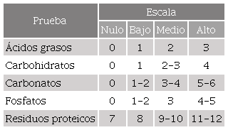 Las pruebas analíticas o spot-tests fueron desarrollados en el Laboratorio de Prospección Arqueológica de la Universidad Nacional Autónoma de México, donde han sido aplicadas tanto para el análisis de áreas de actividad como para los artefactos cerámicos (Barba 2007; Barba, Córdoba y Rodríguez 1991; Barba y Ortíz 1992; Barba, Ortiz y Pecci 2014; entre otros). A continuación, se resumen los protocolos para las cinco pruebas aplicadas (según Barba, Córdoba y Rodríguez 1991; Barba, Hernández y Obregón 2019) (tabla 3):