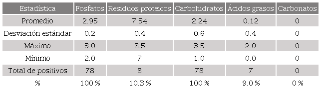 Los carbohidratos son reportados en toda la muestra, con un promedio de abundancia media. Esto hace referencia al uso repetitivo de estos recipientes en el procesamiento y consumo de alimentos vegetales ricos en azúcares y almidones (tabla 4), como es el caso de las semillas y los tubérculos (Barba, Córdoba y Rodríguez 1991). Por el contrario, los residuos proteicos se registran de manera más restringida y en valores bajos. La presencia de estos se relaciona, especialmente, con productos de origen animal, como tejidos musculares, sangre y caldos de carne (Barba, Córdoba y Rodríguez 1991; Barba, Ortiz y Pecci 2014). De manera similar, los ácidos grasos se reportan en abundancias medias y bajas, y derivan tanto de grasas de origen animal como vegetal (Barba y Ortíz 1992; Barba, Ortiz y Pecci 2014).
