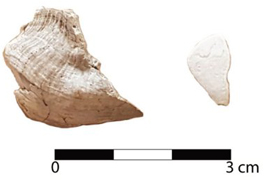 Otro de los hallazgos interesantes de este sitio fue la detección de dos fragmentos de concha. Uno de ellos podría corresponder al género lobatus (llamado strombus), clasificado así por las características de los pliegues de la concha (según una consulta efectuada a la arqueomalacóloga Elodie Mas); sin embargo, por lo pequeño del fragmento no fue posible determinar la especie (véase la fig. 10).