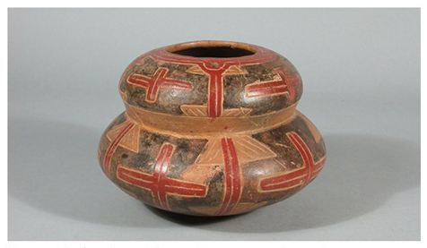 Esta cruz se encuentra también en el siguiente periodo Bagaces (300-800 d. C.), en las figurinas del tipo Galo policromo. En cambio, durante el periodo Sapoa (800-1250 d. C.), en la cerámica de Guanacaste, aparece la llamada «cruz Kan», parecida a la anterior, como motivo central de decoraciones de la cerámica de tipo Mora policromo y Palmira policromo (véase la fig. 12). Esta cruz se relaciona con influencias mesoamericanas. Se trata de una cruz con las extremidades cuadradas y un círculo en el centro.