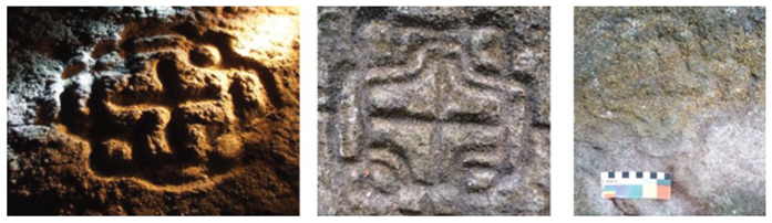 En el Pedregal, a pesar de la proximidad (2 km de Las Yegüitas), no se conoce un ejemplo de cruz concéntrica. De hecho, las cruces son escasas en comparación con los cientos de grabados registrados. Solo otro motivo de cruz aparece en dos rocas, que consiste en dos óvalos cruzados enredados (véase la fig. 19). Aunque es un diseño escaso, se reconoce en figuras femeninas del tipo Galo policromo del periodo Bagaces (Seigne 2023), contemporáneo a las cruces concéntricas de Las Yegüitas. Sin embargo, las cruces se repiten en las rodillas y los hombros de las figurinas, lo que parece descartar una relación con la fertilidad o el nacimiento. También se conoce en un colgante de jade contemporáneo del Museo del Jade (Novoa Espinoza 2016, 135).