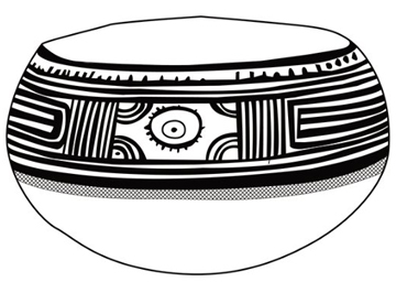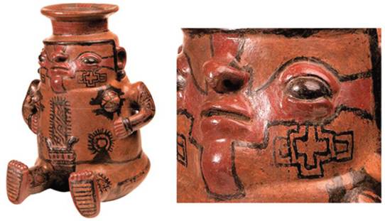 Durante el mismo periodo, cruces concéntricas similares aparecen en algunas representaciones de escudillas con motivos de hombres murciélago que suelen contar con cabezas móviles con soportes delanteros como patas del animal (véase la fig. 16).