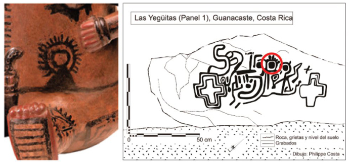 La representación de una oquedad con líneas radiantes alrededor, también presente en el panel inferior de Las Yegüitas, recuerda otro motivo que se repite en las figuras femeninas del tipo Carrillo policromo (véase la fig. 18). Esta información apoya la asociación de motivos repetidos en la datación de los petroglifos en el periodo Tempisque-Bagaces.
