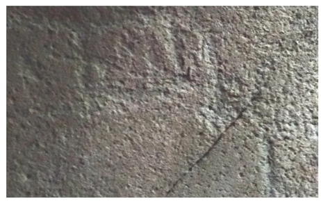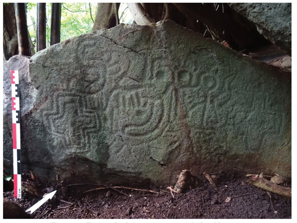 Los petroglifos se encuentran en dos paneles verticales, separados y opuestos en la entrada norte del abrigo. El principal se ubica a nivel de suelo, con la cara grabada hacia adentro, y el segundo, a nivel de techo, en alto, con la cara grabada hacia el exterior (véase la fig. 4). El panel principal decora un bloque rocoso de 1.95 cm de largo por 63 cm de alto, que presenta una cara lisa, lo que contrasta con la textura del resto de la roca.
