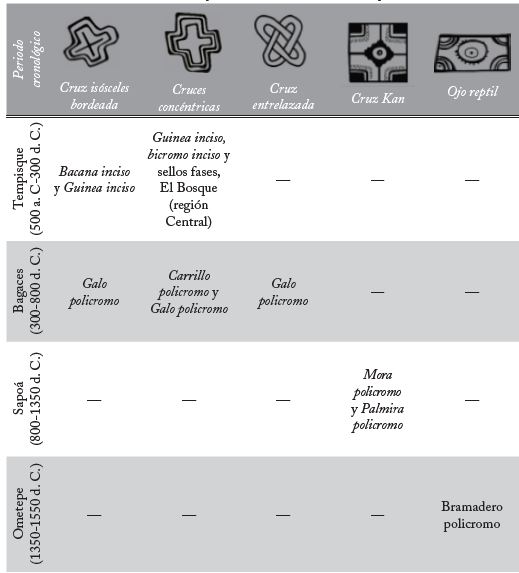 Es notable que la cruz fue un tema central para las poblaciones locales. Se propone la tabla 1 con el fin de resumir la cronología con base a los tipos cerámicos, según la clasificación de Abel-Vidor et al. (1987), en relación con los distintos tipos de cruces.