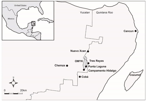 Punta Laguna está sobre la carretera estatal 109 que va de Nuevo Xcan a Cobá (véase fig. 1); es una comunidad pequeña -como gran parte de las comunidades rurales de la región- conformada por alrededor de 25 hogares y 150 personas, también se le conoce como la reserva del mono araña y está ubicada en los linderos del Área de Protección de Flora y Fauna (APFF) Otoch Ma’ax Yetel Kooh (OMYK).