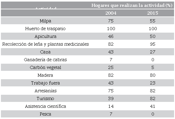 En Punta Laguna los hogares llevan a cabo una estrategia diversificada de manejo de sus recursos naturales, es decir, que realizan diversas actividades productivas, en distintas etapas de sucesión de la selva. Por ejemplo, en 2004, la estrategia de manejo implementada por los hogares de Punta Laguna se componía de 13 actividades económicas o productivas en total y, para 2015, dos de estas actividades desaparecieron: la ganadería de cabras y la pesca. La Tabla 1 muestra el total de actividades y el porcentaje de hogares que las realiza.