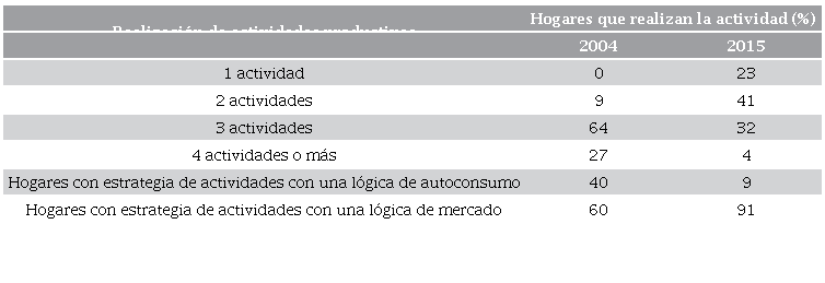 No todos los hogares realizan todas las actividades, esto depende de diversos factores, como el número de personas que conforman el hogar, su edad, su género, la situación económica, etcétera. Lo interesante de estos resultados es comprender cómo los hogares diversifican sus estrategias de vida, cómo enfrentan las diferentes perturbaciones y la lógica de esas actividades; lo anterior se puede apreciar en la Tabla 2, donde, además, se observa la forma en que cambiaron con los años. Es significativo cómo, con la especialización hacia el turismo, los hogares disminuyeron el número de actividades y se concentraron casi exclusivamente en las que les aporta un ingreso monetario.