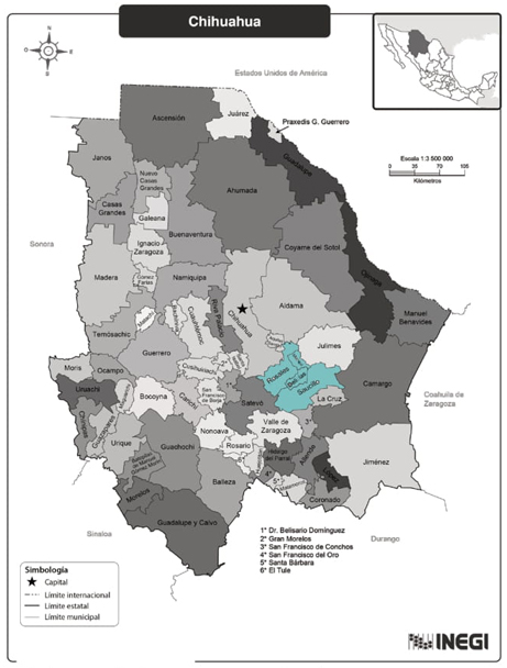 INEGI (Instituto Nacional de Estadística y Geografía). 2016. «Mapas. Chihuahua». https://www.inegi.org.mx/app/mapas/?ag=08.