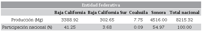 Como se observa en la Tabla 1, en el año 2017 el estado de Sonora es el que obtuvo mayor producción, aportando 54.97 %, coincidiendo así con lo reportado por Salomón Torres, Ortiz Uribe y Villa Angulo (2017); y el estado que menos produjo fue Coahuila, con solo 0.09 % del total nacional.