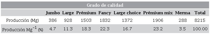 En relación con la calidad, es importante observar que los dátiles son clasificados en grados según características estéticas y de madurez, siendo estas las categorías: jumbo, large, prémium, fancy, large choice, prémium mix y merma. Como se observa en la Tabla 2, el grado jumbo, que es el de mejor calidad, es el que en menos porcentaje se obtiene por cada tonelada cosechada, con solo 4.7 %, seguido por el grado large, con 11.3 %; en cambio, el grado prémium mix, que admite una menor calidad, es del cual se obtiene mayor porcentaje (23.2 %).