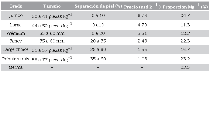 Las características que se utilizan para establecer el precio del dátil son el tamaño y porcentaje de separación de piel del fruto. Estos factores permiten que el dátil se clasifique en alguno de los grados mencionados anteriormente, y se observa que, a mayor tamaño y menor desprendimiento de piel, mejor es el precio (véase la Tabla 3).