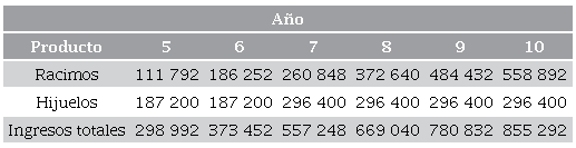 Como se muestra en la Tabla 4, los costos de producción del dátil fluctúan a lo largo del año debido a las diversas actividades requeridas para el cultivo. Los dos primeros meses del año son los de mayor costo para el productor. En contraste, los costos asociados al mantenimiento de los hijuelos de palma permanecen relativamente constantes durante la mayor parte del año. Sin embargo, en el tercer mes se observa un incremento en los costos debido a la aplicación de enraizador y fertilizante a los hijuelos durante ese periodo. Este incremento es notable, ya que durante el resto del año los cuidados necesarios para los hijuelos son consistentes. Por otra parte, como se aprecia en la Tabla 5, el presupuesto de ingresos se realiza de acuerdo a las ventas de dátil e hijuelos de palma datilera. Considerando los pronósticos de producción del dátil e hijuelos, durante los primeros cuatro años no se producen, y por lo tanto no se tienen ingresos. Es hasta el quinto año que la palma produce una cantidad de dátil considerable para su venta, y es en ese año también que los hijuelos desprendidos de la palma en el año cuarto son vendidos. A partir de ahí se obtienen ingresos iniciales de las ventas totales por $298 992, y estos se incrementan conforme los años avanzan y la palma alcanza un punto máximo de producción.