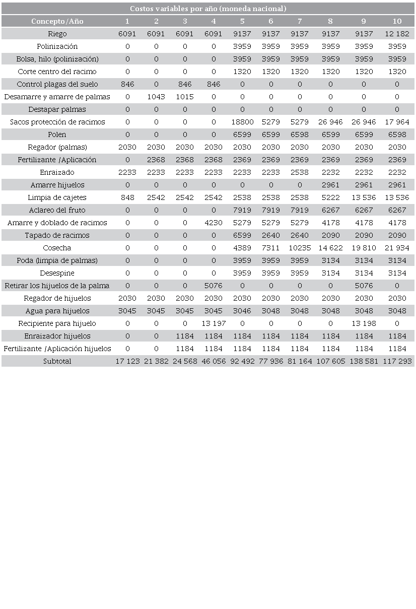 El presupuesto de inversión para una hectárea, estableciendo 156 palmas ha-1, es de $181 455 y, como se observa en la Tabla 4, el costo de mantenimiento del año cinco es de $112 627, desglosando los costos mensuales como corresponde.