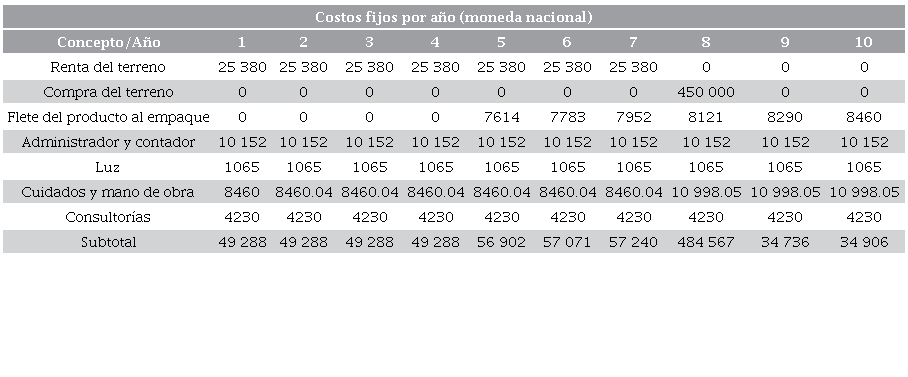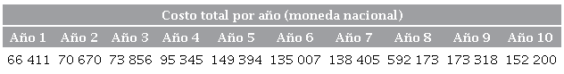 Adicionalmente, se realizó la proyección de costos anuales desde el año uno hasta el décimo año de la plantación, cuyos resultados se observan en las Tablas 6, 7 y 8.