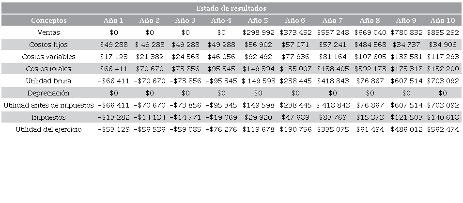 Con dicho estado financiero, se determinó que los primeros cuatro años no se generan ingresos, debido a la falta de ventas, pero a partir de que inician las ventas en el año cinco, el proyecto comienza a ser rentable.