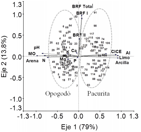 El ACP mostró que los dos primeros componentes fueron significativos y explicaron el 92.8 % de la varianza de los datos. Las condiciones edáficas (textura, pH, N total y MO) tuvieron alta correlación entre sí y diferenciaron claramente las parcelas de Opogodó de las de Pacurita. Sin embargo, la BRF (total y en las dos profundidades) presentó poca relación con las variables edáficas (Figura 1).