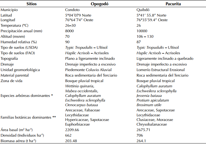 El presente estudio se realizó en bosques pluviales tropicales de la localidad de Pacuríta (municipio de Quibdó) y en la localidad de Opogodó (municipio de Condoto), departamento del Chocó, Colombia. Estas dos localidades pertenecen a la subregión ecogeográfica Central Norte del Chocó biogeográfico, que comprende las cuen cas altas de los ríos Atrato y San Juan (Poveda et al., 2004). Las localidades se encuentran dentro de la unidad geomorfológica de Colinas sedimentarias del Terciario, que se caracterizan por presentar bajas altitudes, formadas por rocas sedimentarias, compuestas por arcillolitas arenosas, areniscas y calizas (West, 1957; Martínez, 1993). Las características ambientales y estructurales específicas de Opogodó y Pacurita se detallan en la Tabla 1.