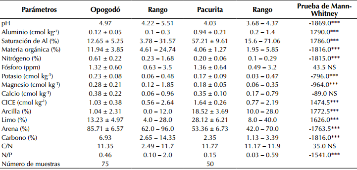Los suelos estudiados son extremadamente ácidos; con mayor acidez y porcentajes altos de saturación de Al en la localidad de Pacurita (Saturación de Al = 57.21%). Se presentaron concentracio nes altas de MO y N, con los mayores registros en Opogodó (MO = 11.94%; N = 0.61%). Las cantidades edáficas de P, Mg, y Ca fueron muy bajas, mientras que los valores de K fueron intermedios; así mismo, la CICE fue baja en las dos zonas. Las concentraciones de P y Ca fueron muy similares en las dos localidades; sin embargo, el resto de los parámetros de fertilidad presentaron diferencias estadísticamente significativas (Tabla 2). Por lo tanto, basados en la menor acidez, altas concentraciones de MO y N, y en los valores intermedios de K, se considera que los suelos de Opogodó son más fértiles que los de Pacurita.