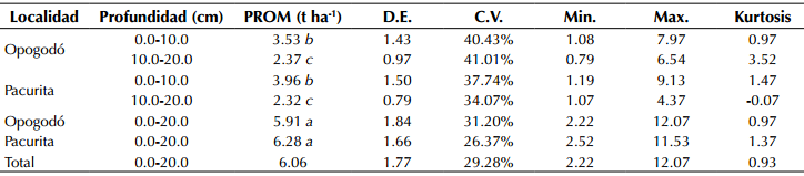 En los bosques de Opogodó se registró una BRF promedio (± D.E.) de 5.91 ± 1.84 t ha-1 entre 0 y 20 cm de profundidad, de la cual el 59% se encontró en los primeros 10 cm. En los suelos de Pacurita se registró una BRF de 6.28 ± 1.66 t ha-1, de la cual el 63% se encontró en los primeros 10 cm (Tabla 3). La BRF presentó diferencias entre profundidades; pero no entre localidades.