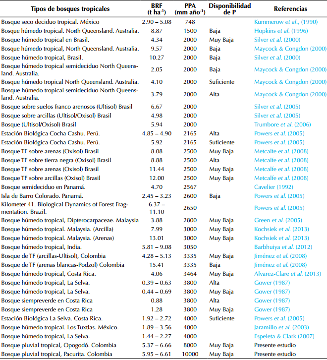 La BRF registrada entre 0 y 20 cm de profundidad, en suelos arenosos de los bosques pluviales tropicales de Opogodó y en suelos arcillosos de Pacurita, se encuentra dentro de los rangos reportados en bosques tropicales de tierras bajas con valores de entre 3 – 120 t ha-1 (Vogt et al., 1985). Nuestros resultados fueron similares a los registrados en otros bosques tropicales de baja altitud con diferentes regímenes de precipitación en Australia (Maycock & Congdon 2000), Brasil (Silver et al., 2000; 2005), Perú (Powers et al., 2005), Colombia (Jiménez et al., 2008), India (Barbhuiya et al., 2012), Costa Rica (Alvarez-Clare et al., 2013) y Malaysia (Kochsiek et al., 2013); así como también a los registrados en bosques semideciduos de Panamá (Cavelier, 1992) y en bosques secos de México (Kummerow et al., 1990) (Tabla 5). El hecho de que estos bosques tropicales con diferentes niveles de precipitación presenten una BRF similar, muestra que otros factores como la disponibilidad de nutrientes (por ejemplo el P disponible – Figura 1) (Gower, 1987; Maycock & Congdon, 2000; Espeleta & Clark, 2007), textura (Silver et al., 2000; 2005; Jiménez et al., 2008; Kochsiek et al., 2013), material parental (Espeleta & Clark, 2007), tipo de vegetación y área basal (Finér et al., 2011), entre otros, podrían tener un mayor efecto sobre la BRF en comparación con la precipitación anual. Al respecto, Finér et al., (2011), afirman que factores como temperatura, precipitación promedia anual, latitud y altitud, explican muy poco las variaciones en la BRF de los bosques tropicales.