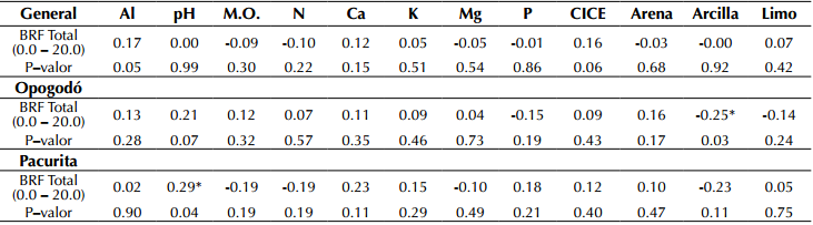 Al analizar los datos de las dos localidades en conjunto se observó que la BRF no presentó correlación significativa con los parámetros edáficos evaluados. El análisis individual en cada localidad mostró correlaciones significativas con algunas variables edáficas, pero muy débiles: en Opogodó la BRF presentó correlación negativa con la arcilla, mientras que en Pacurita la BRF presentó correlación positiva con el pH.