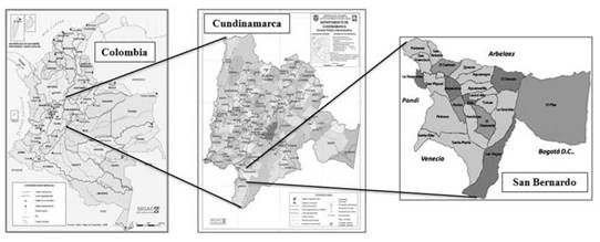 El área de estudio está ubicada en el municipio de San Bernardo (Cundinamarca, Colombia), en las coordenadas 04°08’7.9”N y 074°25’31,5”W, en la vereda Pirineos bajo. La zona presenta una altitud de 2000 m, una precipitación media anual de 1528 mm y una temperatura promedio de 20°C y una historia de disturbio de cerca de 50 años (Alcaldía Municipal de San Bernardo, 2012; figura 1). El 45% del área de estudio correspondió a coberturas de pastizal asociadas a actividades agrícolas y pecuarias (67 173 m2), el 28.2% a coberturas de relictos de bosque secundario (42 020 m2) y el 26.8 % a cobertura de plantación de Eucalyptus globulus (40 005 m2). De acuerdo con el mapa de zonificación de suelos, las áreas están clasificadas como zonas de agricultura tradicional, las cuales están compuestas por suelos susceptibles a procesos erosivos y de mediana a baja capacidad agrológica, donde se debe dedicar como mínimo el 20% de los predios para uso forestal protector- productor (Alcaldía Municipal de San Bernardo, 2000).