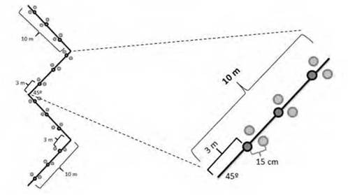 En cada cobertura se trazaron tres transectos de 40 m, dispuestos cada 10 m en zig-zag con un ángulo de 45°. A lo largo de cada transecto se tomaron muestras por triplicado cada tres metros (Cardona & Vargas, 2004; Cantillo et al., 2008), con ayuda de un dispositivo Shelby de 3” (7.62 cm de diámetro) y a una profundidad de 15 cm (Cárdenas et al., 2002; Cardona & Vargas, 2004; Cantillo et al., 2008; Beltrán, 2012; figura 2).
