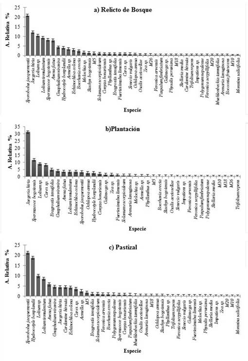 En el relicto de bosque la mayor abundancia registrada fue para Sporobolus jacquemontii (21.33%), Jaegeria hirta (12.42%), Lolium sp. (10.45%) y Lolium temulentum (9.43%) (figura 3a). En la plantación, las especies con mayor abundancia fueron J. hirta (31.26%), Spermacoce bogotensis (11.84%), Lolium sp. (8.99%) y Carex sp. (8.27%) (figura 3b). Por último, en el pastizal, los mayores valores de abundancia fueron para S. jacquemontii (21.65%), Hydrocotyle bonplandii (19.11%), Lolium sp. (10.08%) y L. temulentum (8.72%) (figura 3c).