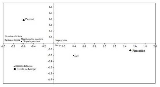 Teniendo en cuenta la riqueza, el análisis de correspondencia indicó que para plantación y relicto de bosque se presentó Passiflora sp. como especie común entre las dos coberturas. En el caso del relicto de bosque, se registró la especie Bocconia frutescens limitada a esta unidad de cobertura, mientras que las especies J. hirta y Zea sp. son comunes para las tres coberturas. Las especies Monnina salicifolia, Muehlenbeckia tamnifolia, Physalis peruviana y Cardamine hirsuta se registraron como especies comunes entre pastizal y relicto de bosque. Se consideran aquellas especies del banco de semillas que más abundan para las tres coberturas. (figura 4).