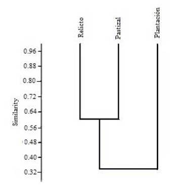 El índice de similitud de Bray-Curtis demostró que las unidades de cobertura de relicto de bosque y pastizal se relacionan en un 60% aproximadamente. Mientras que estas se relacionan con la unidad de plantación en un 34% aproximadamente (figura 5).