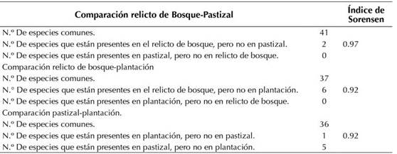 De acuerdo con la composición de especies encontradas en las diferentes unidades de cobertura, el índice de Sorensen indicó que las tres coberturas son iguales entre sí, ya que presentan gran cantidad de especies en común (tabla 1).