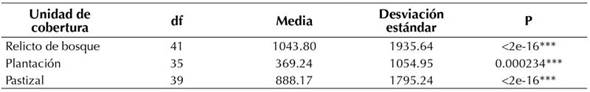 El análisis estadístico de los datos (ANOVA) ratificó que existen diferencias significativas en las tres coberturas (P=0.00409, F=5.584, df=2) teniendo en cuenta la abundancia de las especies (tabla 2). La mayor abundancia se presentó en el relicto de bosque con una media de 1043.80, seguida por el pastizal con una media de 888.17 y finalmente la plantación con una media de 369.24.