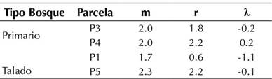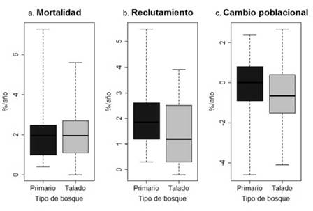 Los bosques talado y primario en la reserva El Paujil no presentaron diferencias significativas en la tasa anual de mortalidad (t = 0.13, gl = 98, p = 0.45; figura 1a), a pesar de la variación encontrada al hacer el análisis por subparcelas de 20x20 m, se puede ver que al comparar entre parcelas de 1 ha, el promedio es igual para los dos tipos de bosque, con una tasa anual de mortalidad promedio igual a 2 % (tabla 1). El reclutamiento fue mayor para el bosque primario (t = 2.91, gl = 98, p < 0.01; figura 1b), y, al igual que en el caso de la mortalidad a escala de 1 ha se corrobora el resultado (tabla 1). El cambio poblacional fue cero para bosque primario y negativo para el talado, a escala de 20 x 20 m se encuentran diferencias significativas entre tipos de bosque (t = 2.16, gl = 98, p = 0.02; figura 1c).