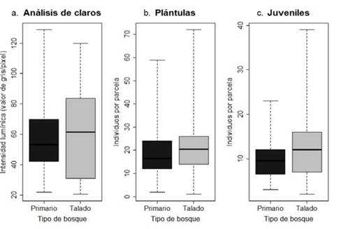 Para el análisis de claros se utilizaron las fotos tomadas en el punto central de cada una de las subparcelas de 20x20 m, escogiendo una por subparcela para determinar el valor de gris por pixel (donde 0 significa negro y 255 significa blanco) con el programa Image J (Image J, 2007). Este valor representa la intensidad lumínica en el sotobosque y es comparado con una prueba t de una cola para dos muestras entre los dos tipos de bosque utilizando el programa estadístico R versión 3.0.1, librería Vegan (R Core Team, 2013). Adicionalmente, como indicadores del proceso de regeneración de los bosques después del disturbio, se comparó la cantidad de plántulas y juveniles presentes en los dos tipos de bosque con pruebas t de una cola para dos muestras, con la aproximación de Welch cuando las varianzas no eran similares en el programa estadístico R versión 3.0.1 (R Core Team, 2013).