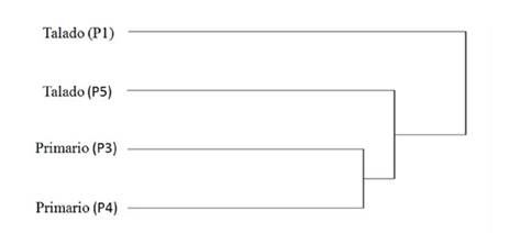 Se encontró una alta afinidad florística en las parcelas del bosque primario, mientras que el bosque talado es más heterogéneo, con una parcela más similar al grupo de bosque primario que la de su mismo tipo de bosque (figura 4).
