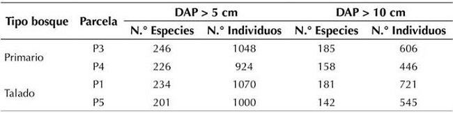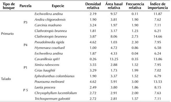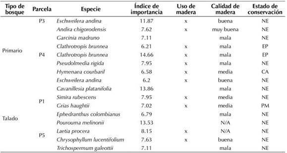 Las especies más importantes de las parcelas de bosque primario difieren de las del bosque talado, además, son en su mayoría árboles con madera de buena calidad (Fern, 2014), objetivo de las reforestadoras (tabla 2). El componente que más influyó en la determinación del índice de importancia fue el área basal relativa (anexo 2). El estado de conservación de estas especies en su mayoría no ha sido evaluado, no obstante se conoce que Clathrotropis brunnea está en peligro, Hymenaea courbaril se encuentra en preocupación menor y Grias haughtii es vulnerable (tabla 2).