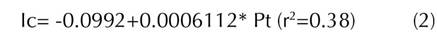 Donde: Ic es el índice de crecimiento residual de C. alliodora, Pt es el monto de precipitación anual, los coeficientes son significativos para el modelo (p>0.05)