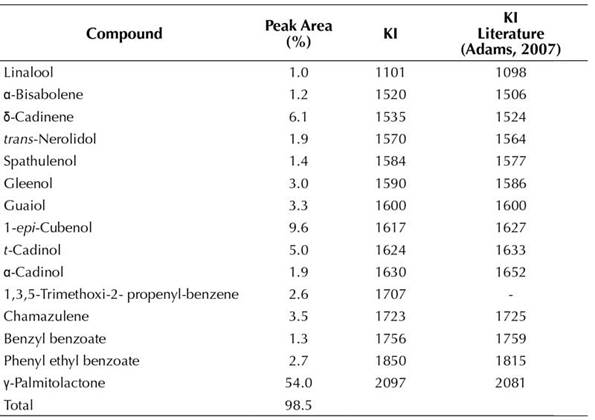 The wood essential oil of A. cinnamomiflora was obtained by hydrodistillation using a Clevenger trap obtaining a 0.05% yield. The chemical composition was determined by gas chromatography / mass spectrometry (Table 1). Fifteen components of the oil were identified corresponding to a 98.55%, the major ones are γ-palmitolactone (54.0%), 1-epi-cubenol (9.6%), δ-cadinene (6.1%), t-cadinol (5.0%) and chamazulene (3.5%).